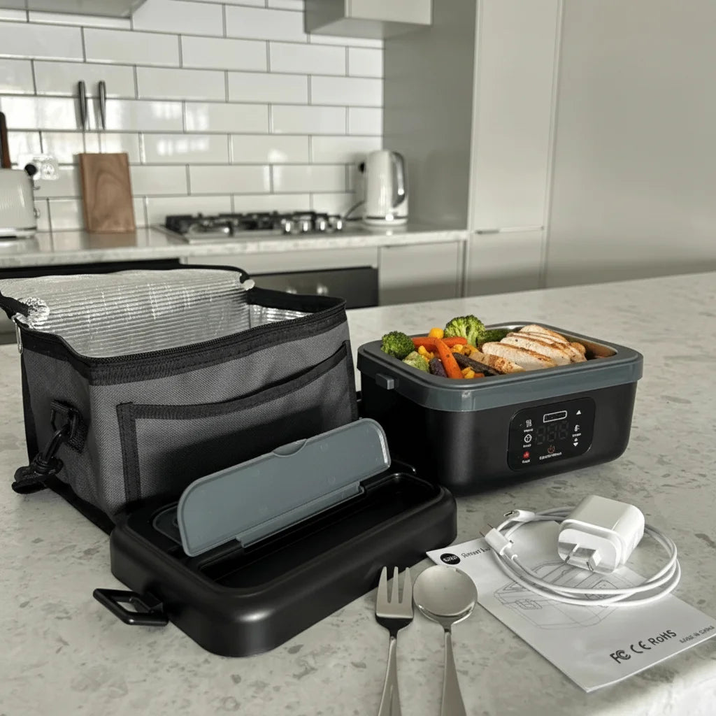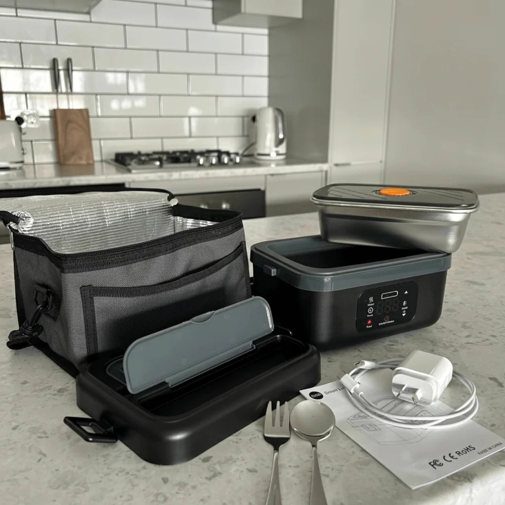 It comes complete with everything you need: a stainless steel inner container, an insulated carrying bag, a fork and spoon, a power adapter, and a charging cable. All set for convenience!